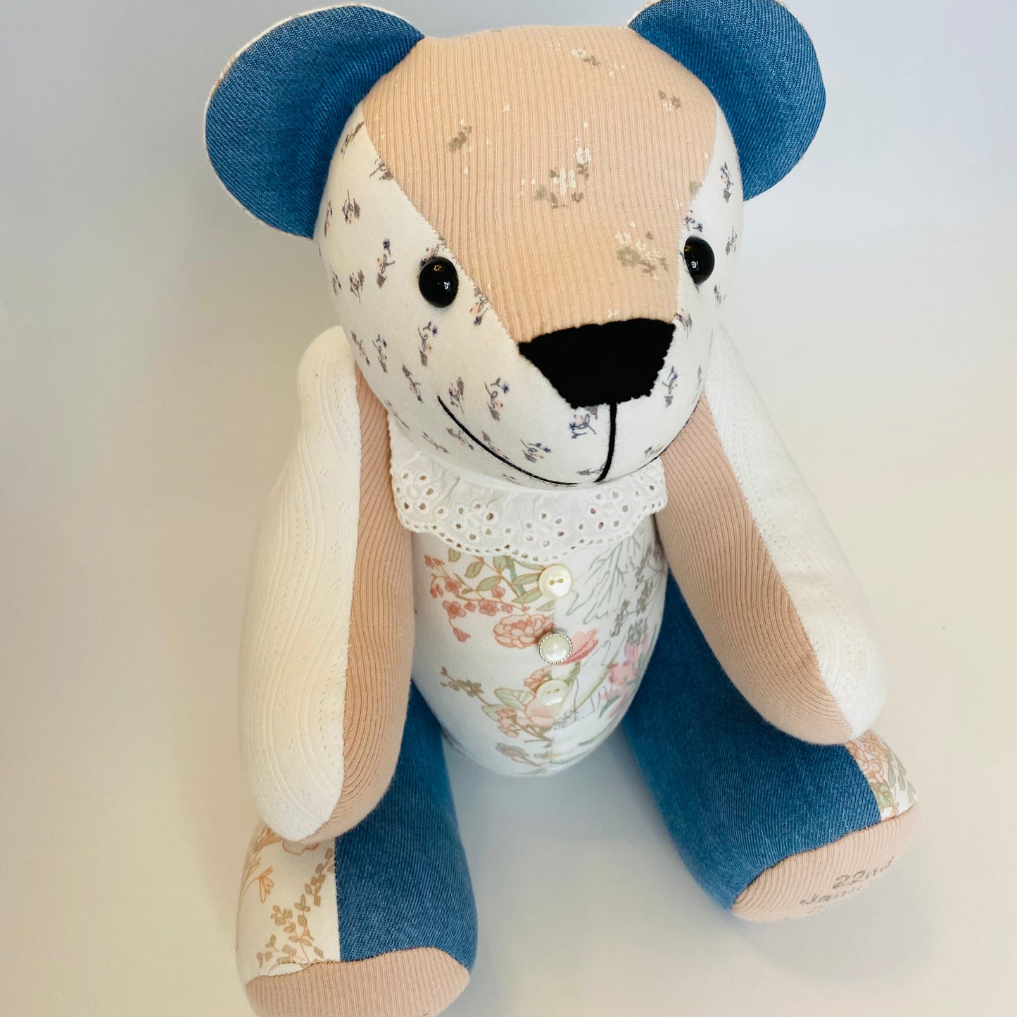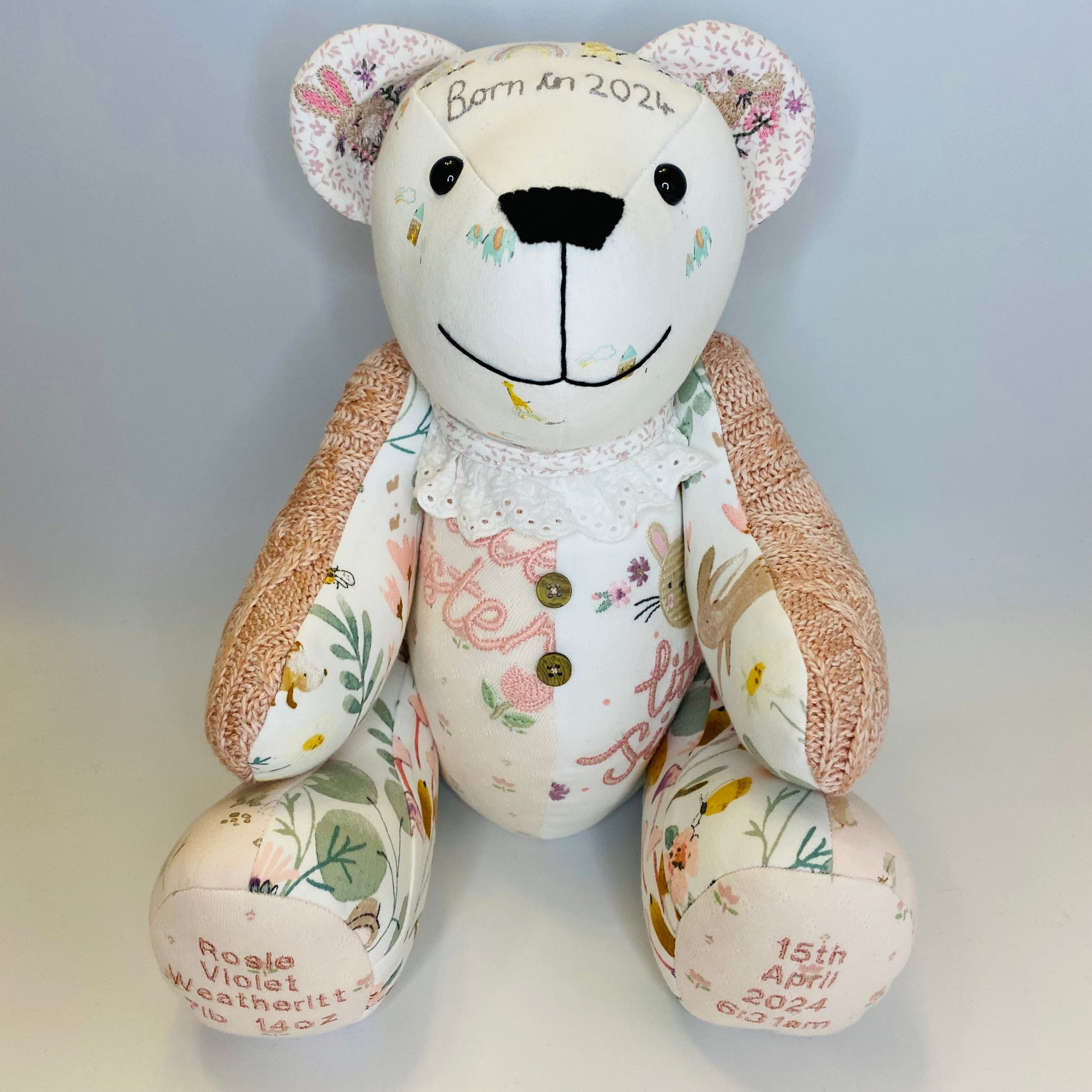Creating your Keepsake Bear is simple. Send us 7-8 items of your baby's clothing (more can be added upon request), and we'll transform them into a one-of-a-kind treasure. Plus, personalised embroidery can be added to the bear's feet, such as: