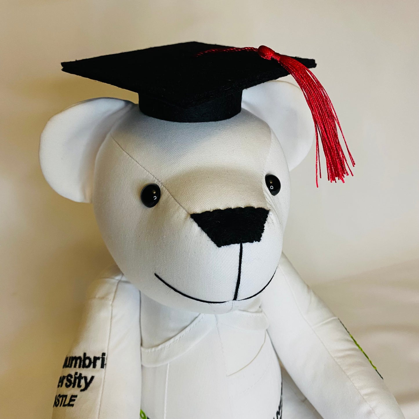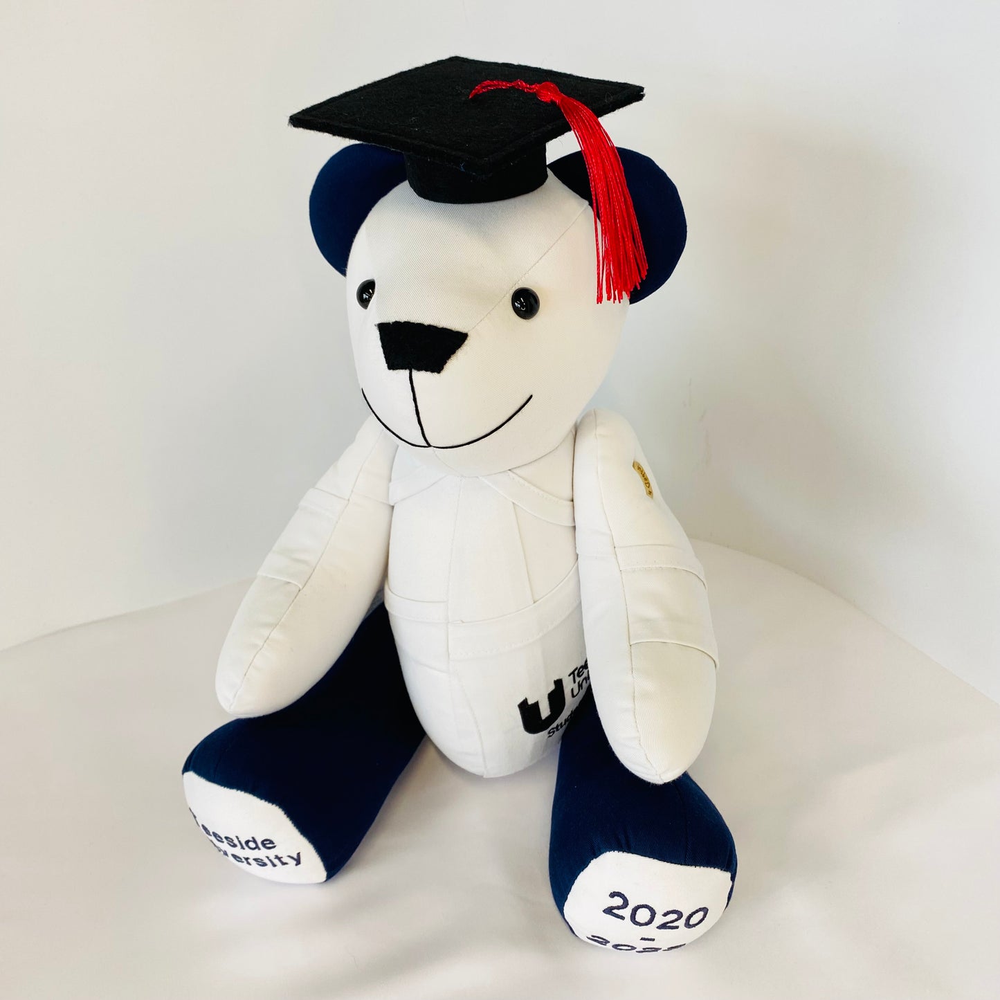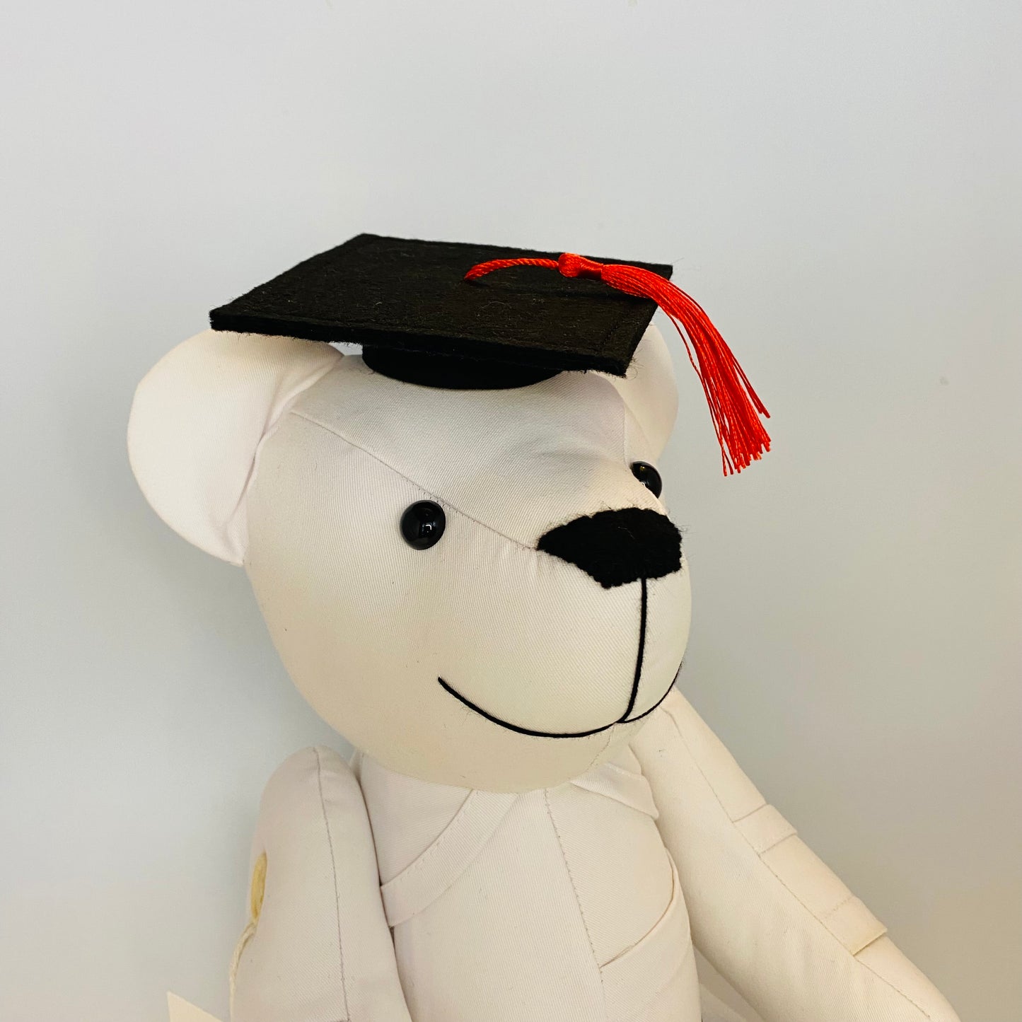 A Graduation Bear, stitched with love from any type of fabric, includes an additional graduation cap. Each thread holds a story, making it a perfect keepsake for celebrating academic achievement. The bear can be made from any fabric that represents the graduate, ensuring a unique and meaningful connection. The bear's joints are created using buttons and strong thread to allow them to move, similar to a traditional teddy bear.