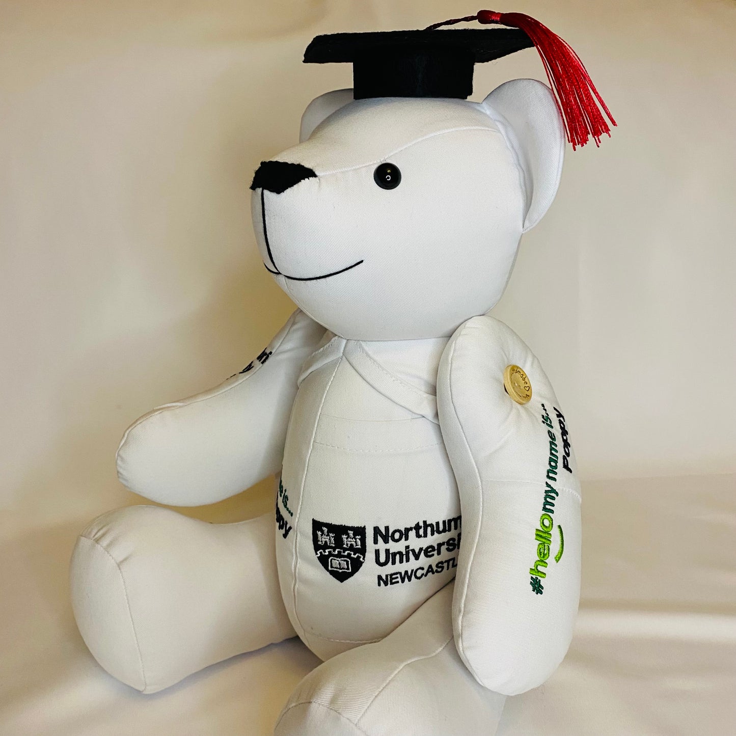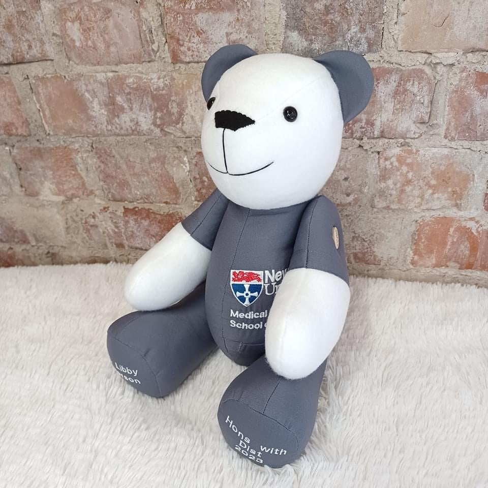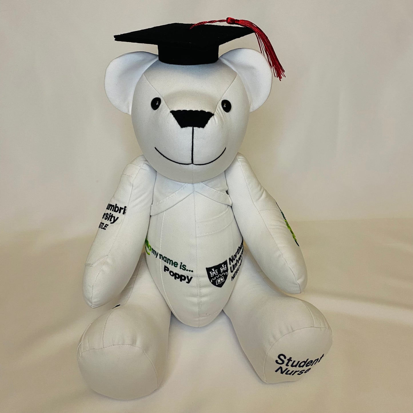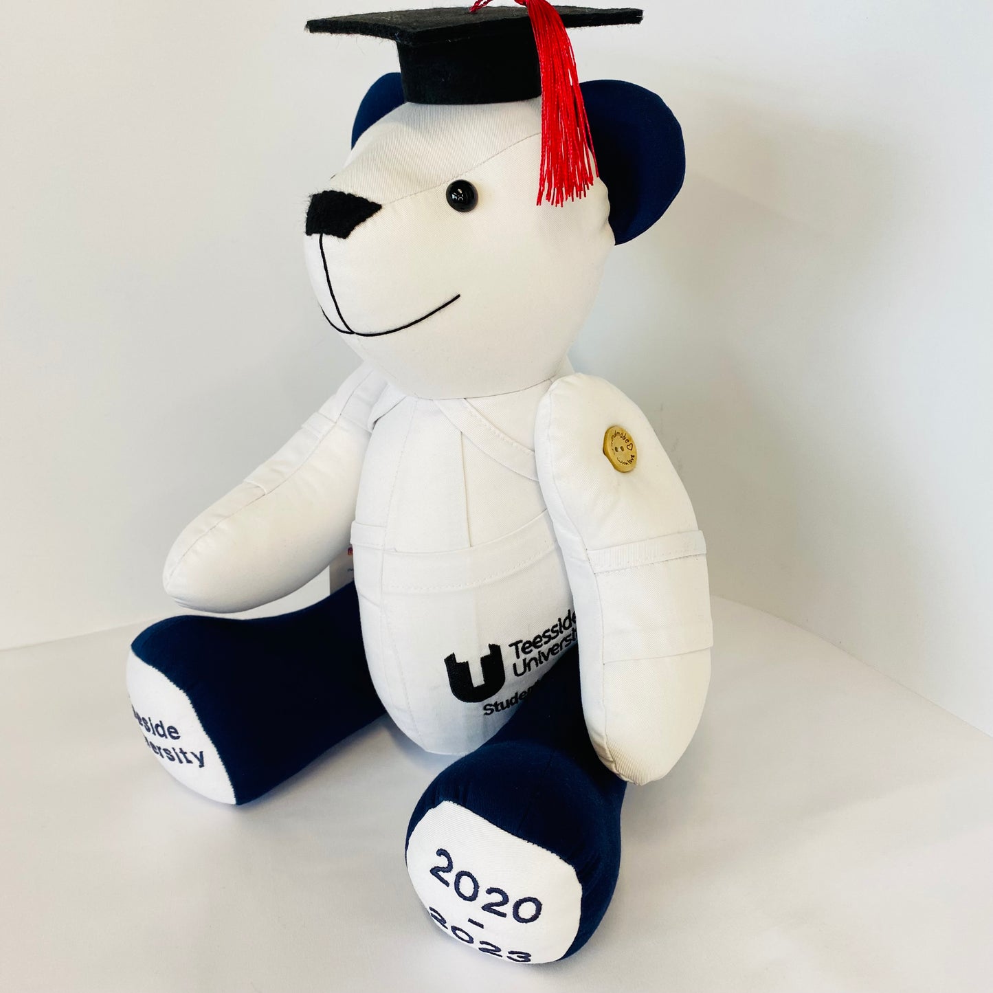 A Graduation Bear, stitched with love from any type of fabric, includes an additional graduation cap. Each thread holds a story, making it a perfect keepsake for celebrating academic achievement. The bear can be made from any fabric that represents the graduate, ensuring a unique and meaningful connection. The bear's joints are created using buttons and strong thread to allow them to move, similar to a traditional teddy bear.