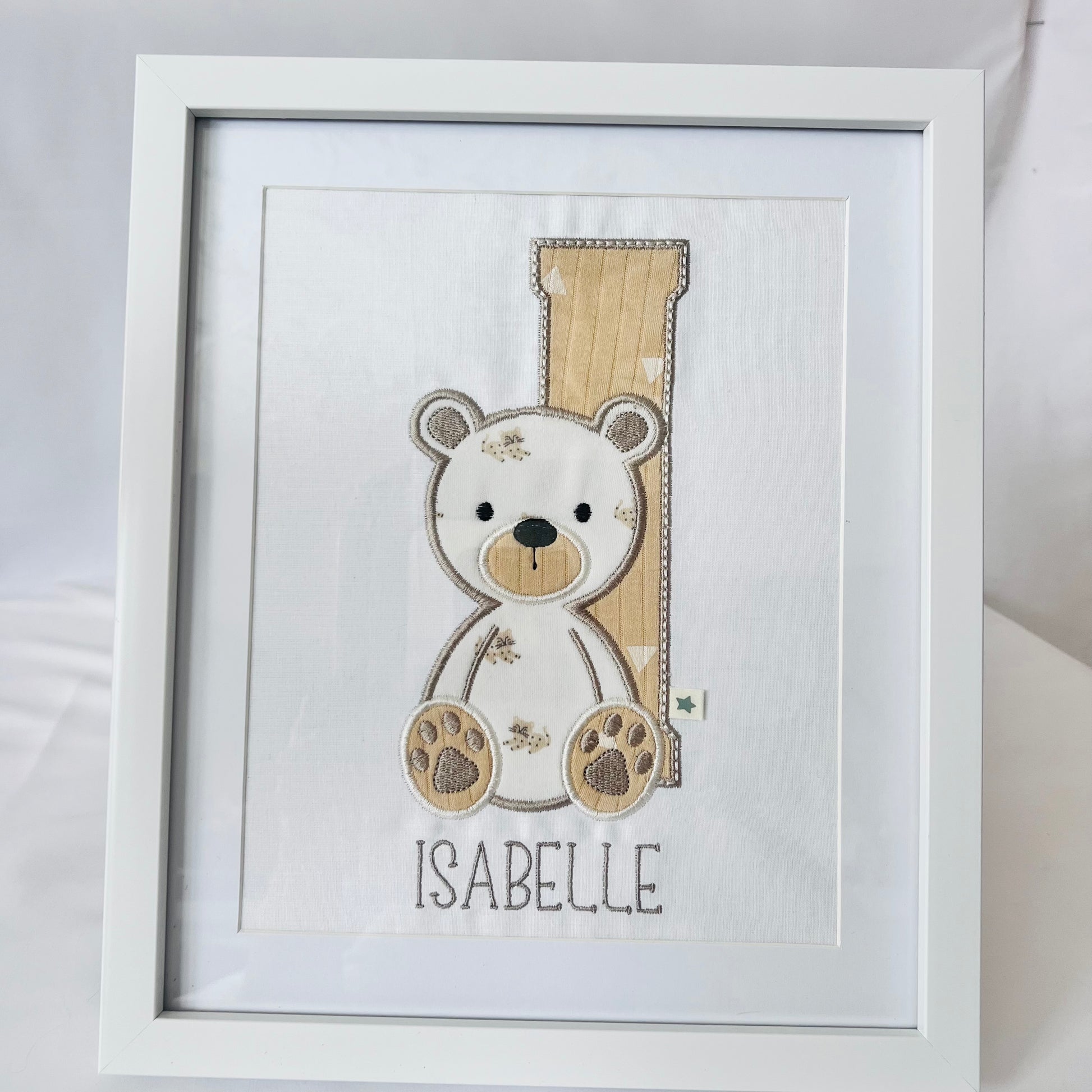 - Features a stitched initial letter with a teddy bear applique on soft white cotton