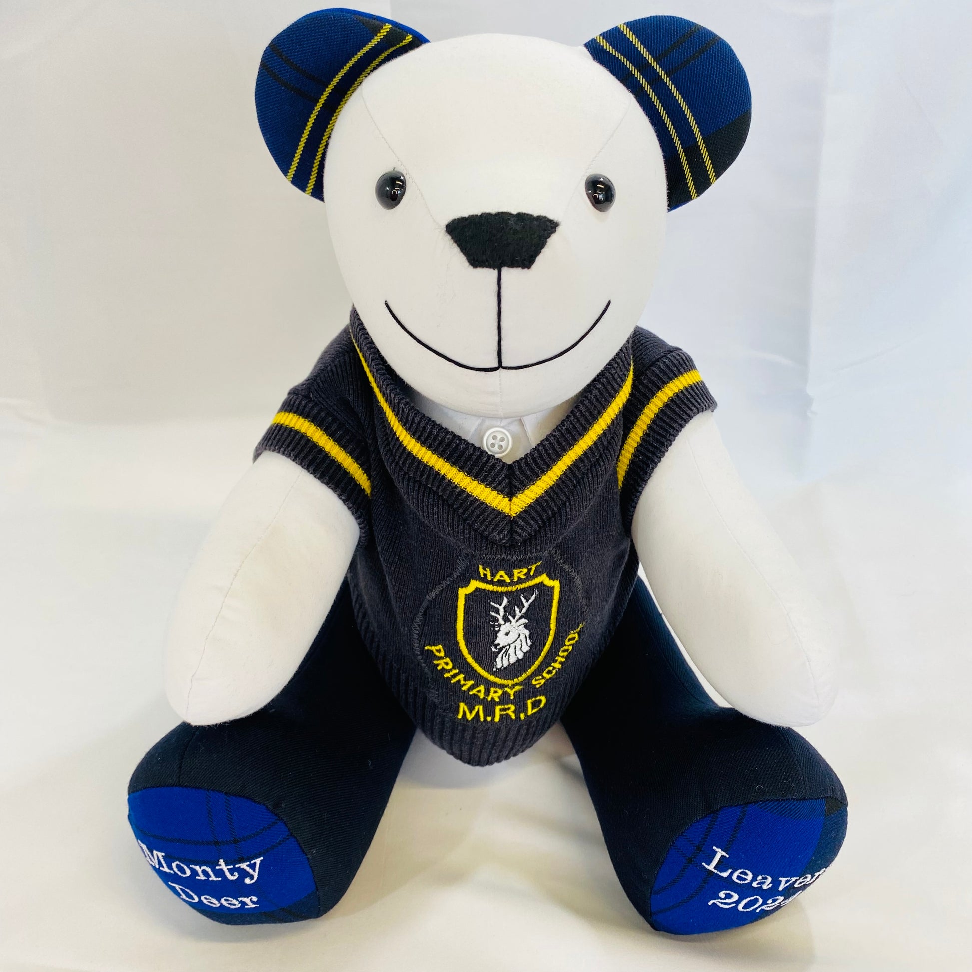 Sits approx. 12 inches (30 cms) A Keepsake Bear, stitched with love from any type of School uniform.